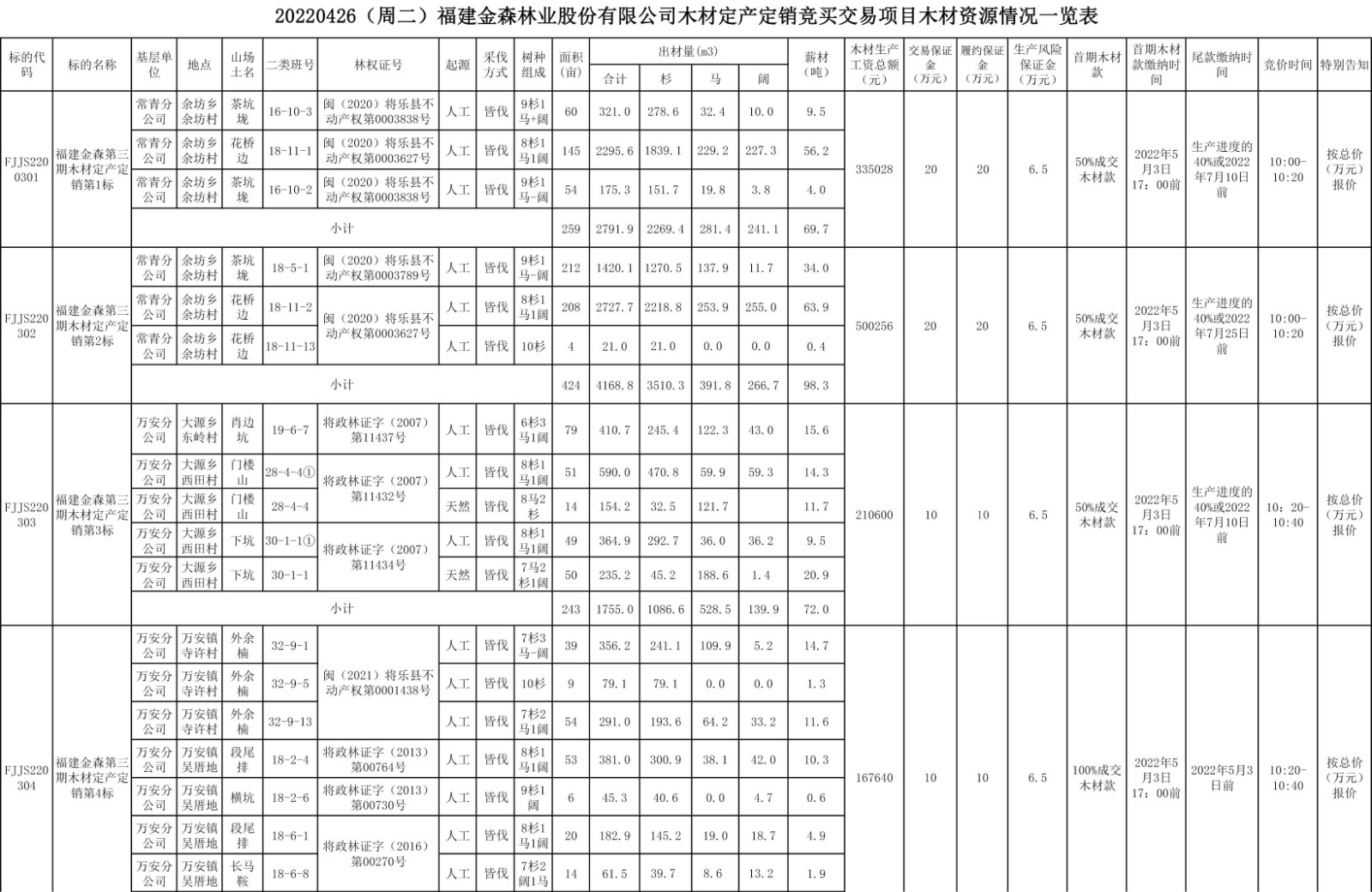 20220426(周二)福建金森林業(yè)股份有限公司木材定產(chǎn)定銷競買交易項目