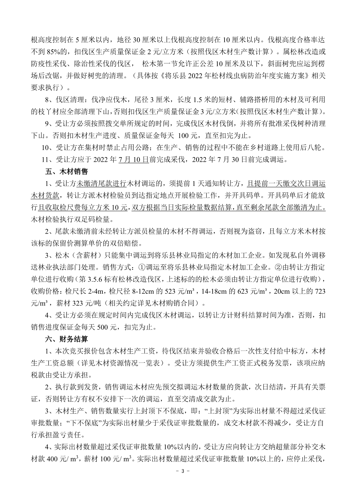 重要信息披露 | 1、標的簡介所列的出材量等數(shù)據(jù)僅供參考,標的以現(xiàn)狀交付,轉(zhuǎn)讓方及交易中心不承擔(dān)標的面積與實測面積、標的出材量與實際出材量差異等責(zé)任,不調(diào)整相應(yīng)的成交價格。 2、本次競買報價包含木材生產(chǎn)工資,木材生產(chǎn)工資總額詳見木材資源情況一覽表,待伐區(qū)結(jié)束并驗收后一次性支付給受讓方。 3、銷售費用、成交后發(fā)生的政策變化費用、稅收均由受讓方承擔(dān)。 4、松木(含薪材)只能集中調(diào)運到將樂縣林業(yè)局指定的木材加工企業(yè)。如發(fā)現(xiàn)私自外調(diào)的,將移送林業(yè)執(zhí)法部門處理。銷售方式:①調(diào)運至將樂縣林業(yè)局指定木材加工企業(yè)。②由轉(zhuǎn)讓方指定單位進行收購(第3.5.6標中有松木改造伐區(qū),上述標的的松木必須由轉(zhuǎn)讓方指定單位進行收購)(相關(guān)約定詳見木材購銷合同)。 5、受讓方應(yīng)于2022年7月10日前完成采伐,2022年7月30日前完成調(diào)運。 6、本次交易第1標和第2標木材運輸需經(jīng)過木材建造的花橋,限載4m,同時,第1標伐區(qū)道路開設(shè)需經(jīng)過軍用光纜,道路開設(shè)時應(yīng)避開。第4標寺許村伐區(qū)運輸需經(jīng)過高速公路底下涵洞,限高限載6m3,吳厝地村伐區(qū)道路開設(shè)需經(jīng)過電站的水管。一旦參與交易表明意向受讓方已認可并接受該風(fēng)險,由該風(fēng)險產(chǎn)生的一切后果和費用由意向受讓方承擔(dān)。 7、未盡事宜詳見木材資源情況一覽表、競買約定、木材生產(chǎn)承包合同(范本)、木材購銷合同(范本)、伐區(qū)位置示意圖等本公告其他附件。 | ||