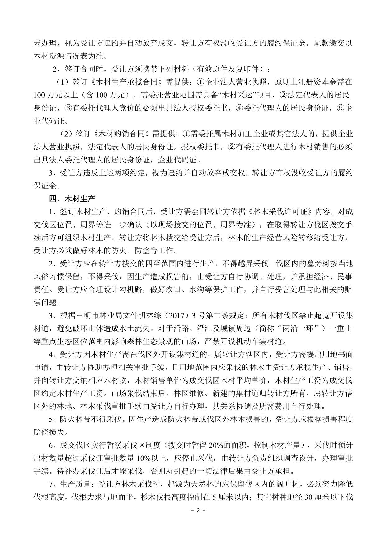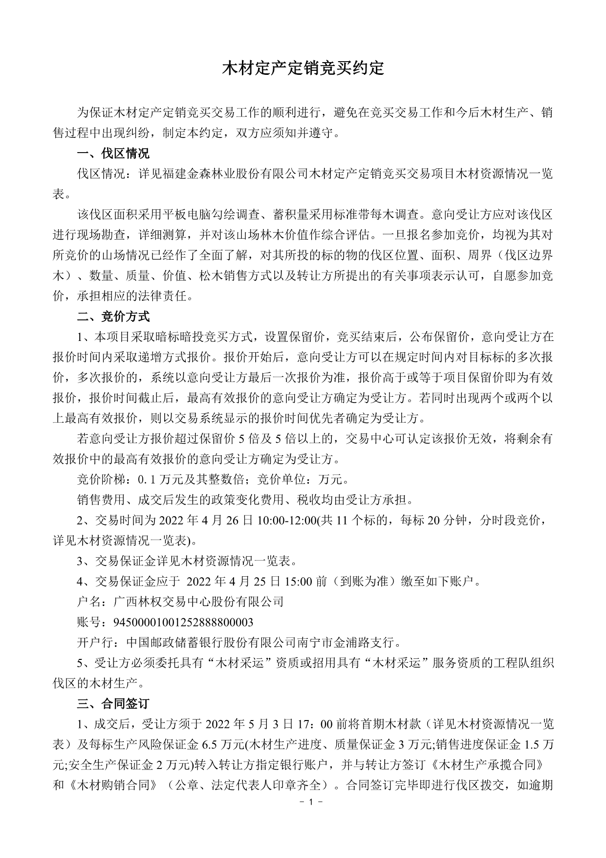 保證金及 處理方式 | 1.須交納的交易保證金詳見木材資源情況一覽表。 2.交易保證金應(yīng)于2022年4月25日15:00前(到賬為準)繳至如下賬戶: 戶名:廣西林權(quán)交易中心股份有限公司 賬號:94500001001252888800003 開戶行:中國郵政儲蓄銀行股份有限公司南寧市金浦路支行 注: ①交易保證金只接受銀行柜臺、網(wǎng)銀、電匯轉(zhuǎn)賬,不接受ATM轉(zhuǎn)賬、現(xiàn)金繳款; ②交易保證金轉(zhuǎn)賬單上須注明參與競拍哪一標的保證金 (如:0426金森1標保證金)。 3. 交易成交,在收到交易雙方出具的《款項收訖及正式書面合同簽訂確認函》后的5個工作日內(nèi),受讓方已交納的交易保證金由交易中心直接轉(zhuǎn)到福建金森林業(yè)股份有限公司指定銀行賬戶充抵履約保證金。 4.交易成交,受讓方如未按本公告約定與轉(zhuǎn)讓方簽訂成交文件的,或違反交易中心交易規(guī)則的,其已交納的交易保證金將不予返還; 5.未成交者的交易保證金交易中心將在交易結(jié)束后次日起3個工作日內(nèi)全額無息返還。 | ||