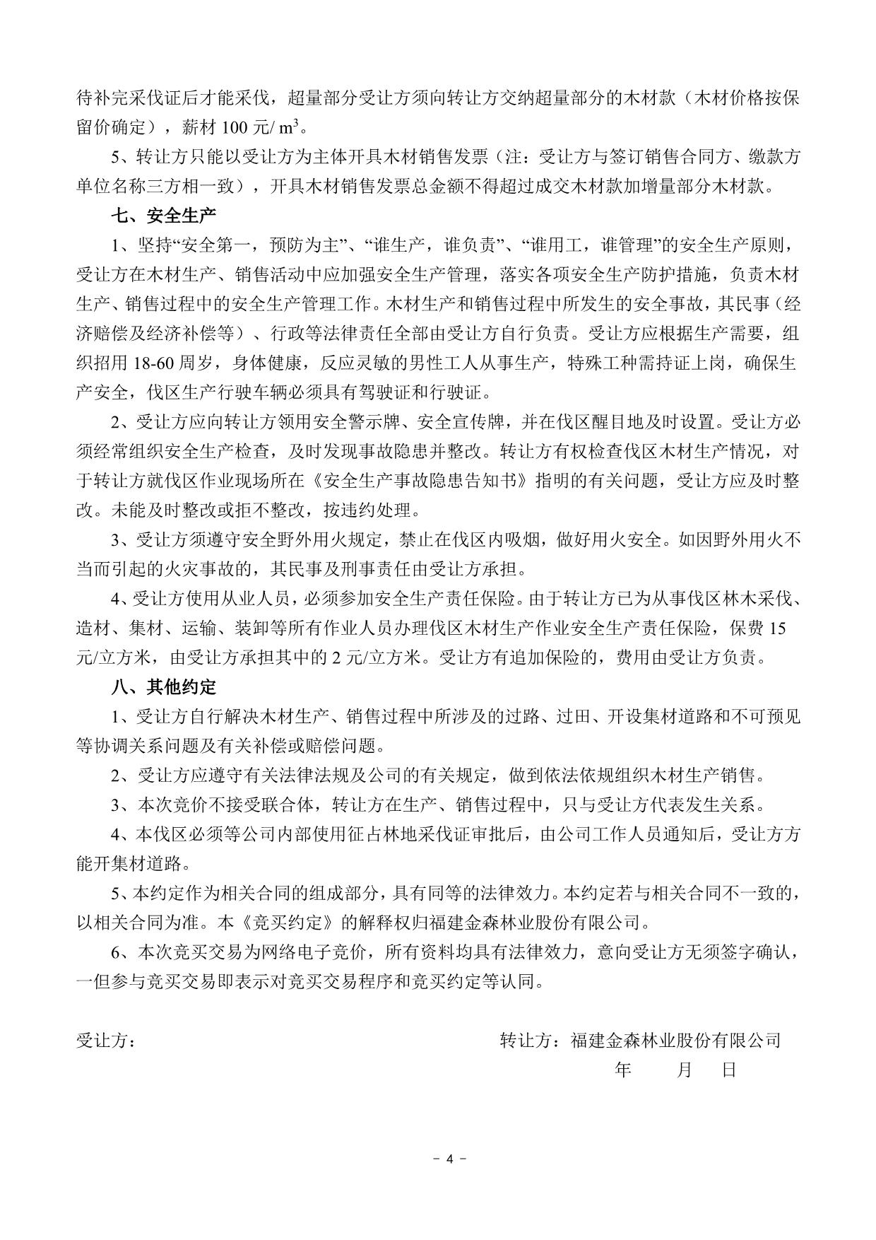 成交確認、價款支付及合同簽訂 | 1 .成交后的兩個工作日內(nèi)受讓方以微信、郵箱等方式收到《成交通知書》掃描件或電話通知;若受讓方未及時收到成交通知書的,請主動與轉(zhuǎn)讓方聯(lián)系。 2.價款交納日期及方式:成交后,受讓方須于2022年5月3日17:00前將首期木材款(詳見木材資源情況一覽表)及每標生產(chǎn)風(fēng)險保證金6.5萬元(含木材生產(chǎn)進度、質(zhì)量保證金3萬元;銷售進度保證金1.5萬元;安全生產(chǎn)保證金2萬元)轉(zhuǎn)入轉(zhuǎn)讓方指定銀行賬戶,并與轉(zhuǎn)讓方簽訂《木材生產(chǎn)承攬合同》和《木材購銷合同》。尾款交付方式以木材資源情況一覽表為準。 轉(zhuǎn)讓方指定銀行賬戶如下: 戶名:福建金森林業(yè)股份有限公司 開戶銀行:福建將樂成功村鎮(zhèn)銀行股份有限公司 賬號:9031510010010000033058 3.受讓方不依據(jù)本公告的要求履約的,視為自動放棄受讓資格,其已交納的交易保證金不予退回,并對交易中心因此造成的損失承擔(dān)賠償責(zé)任,轉(zhuǎn)讓方有權(quán)將該標的重新組織競買交易。 | ||